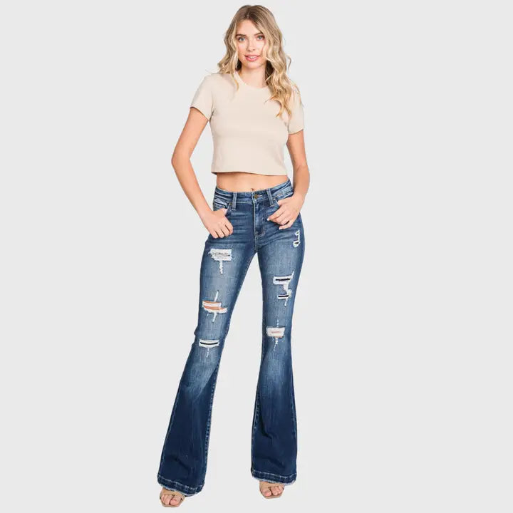 DESTROYED MID RISE STRETCH FLARE W/ PATCH WORK - 9" Rise, 34" Inseam, Modeled in size 3/25 - Leg opening : 22" - Mid-rise flare silhouette - Distressed patches - Button closure and zip fly - 5-pocket styling