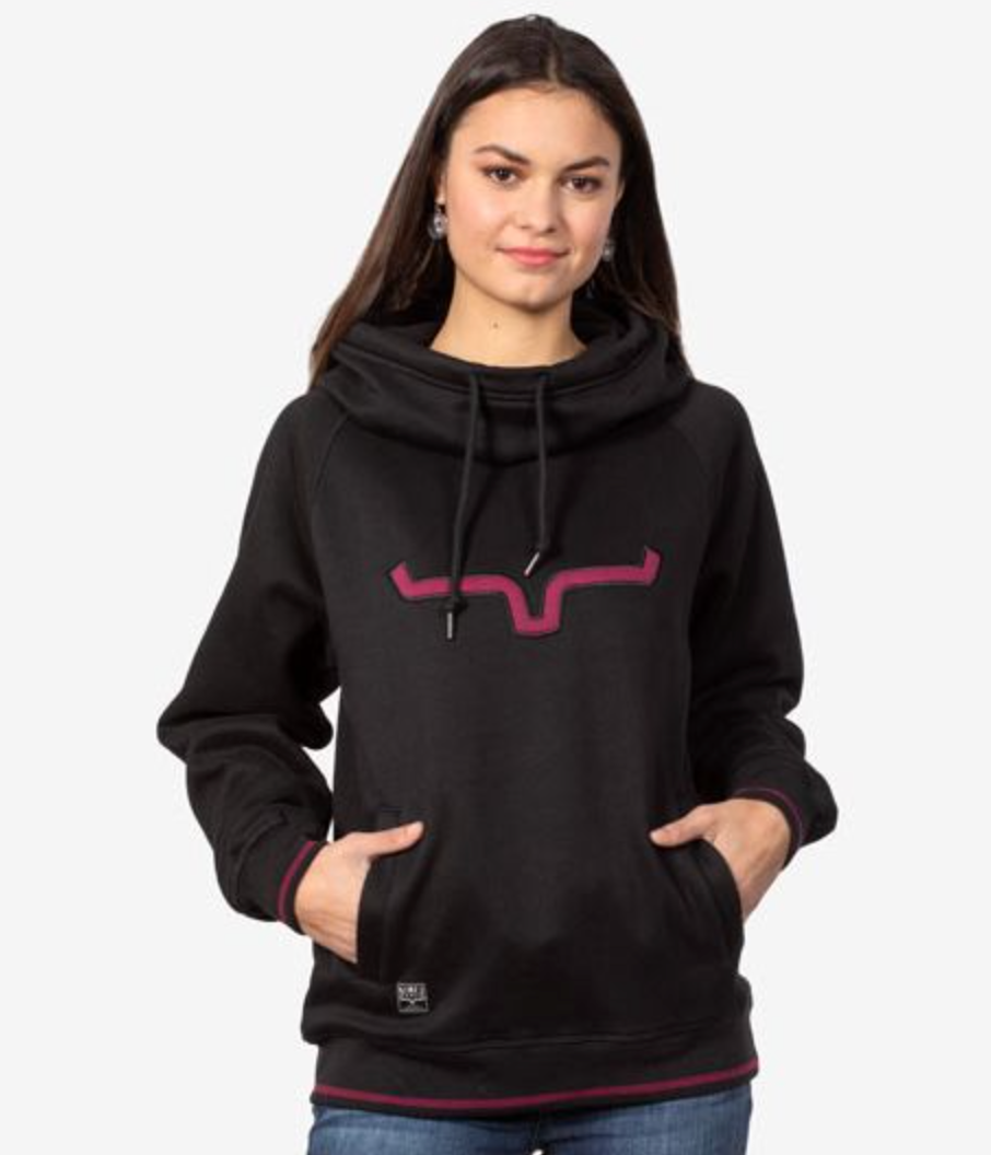 The Two Scoops Hoodie features a cowl-neck hood and relaxed fit for comfortable everyday wear. The contrasting knotted hood drawstrings and single stripe hem and cuffs make this hoodie stand out. Details are completed with a large embroidered horn applique at the chest and a small Kimes Ranch logo patch at the large pouch pocket. This hoodie takes the cake for most comfortable.